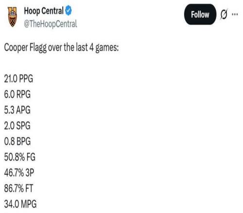 过去4场比赛,弗拉格场均出战34分钟,可以轰下21分6板5.3助2断0.8帽,投篮命中率50.8%,三分46.7%,罚球86.7%。